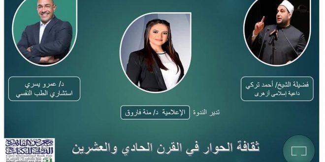 المناقشة بعنوان “ثقافة الحوار في القرن الحادي والعشرين” وضيفا المناقشة الدكتور عمرو يسري استشاري الطب النفسي والشيخ أحمد تركي الداعية الأزهرى وتديرها الإعلامية منة فاروق مذيعة قناة دريم.