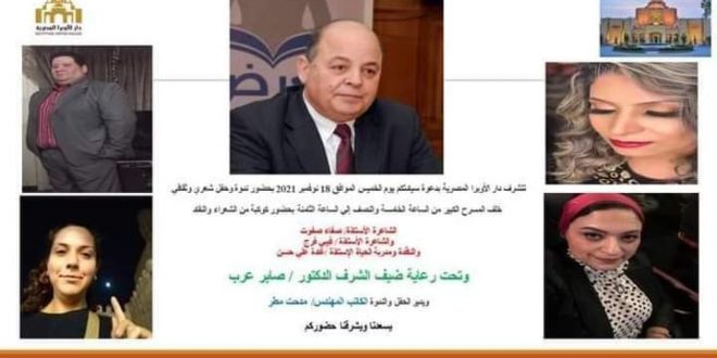 تستضيف قاعة سينما الحضارة بدار الأوبرا المصرية الحفل الثقافي والفني، لإلقاء الشعر واكتشاف المواهب والذي يقام تحت رعاية الدكتور صابر عرب وزير الثقافة السابق وذلك يوم الخميس المقبل ١٨ نوفمبر .