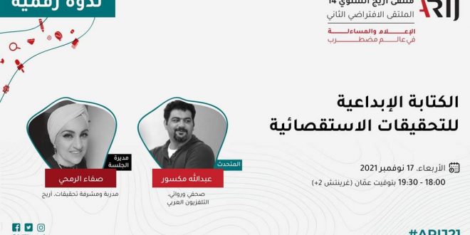 تعقد في ١٧ نوفمبر المقبل، رقميا، ندوة ” الكتابة الإبداعية للتحقيقات الاستقصائية”، وذلك عبر ملتقى أريج السنوي الرابع عشر.