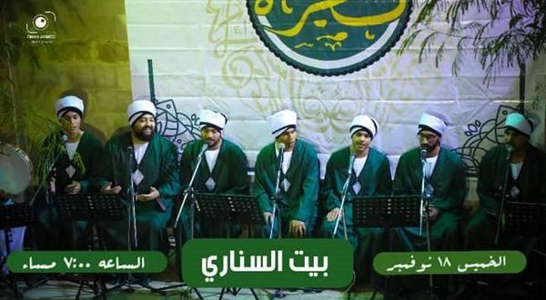 يستضيف بيت السناري الأثري، حفلا فنيا جديدا لفرقة “نظرة” للغناء والموسيقى الروحية، في السابعة من مساء الخميس المقبل الموافق 18 نوفمبر الجاري، بمقر البيت في السيدة زينب.