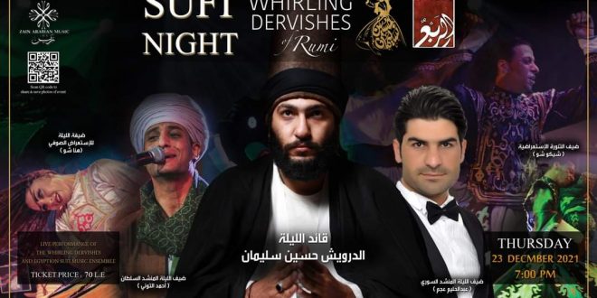 يقيم مركز الربع الثقافي بشارع المعز، ليلة صوفية من التجلِّي الصوفي، والتأمل، والصفاء الذهني، والسلام الروحاني، مع أنغام الموسيقى الصوفية والإنشاد، و الدوران الصوفي المولوي بقيادة الدرويش حسين سليمان، وذلك يوم غد الخميس ٢٣ ديسمبر ٢٠٢١.