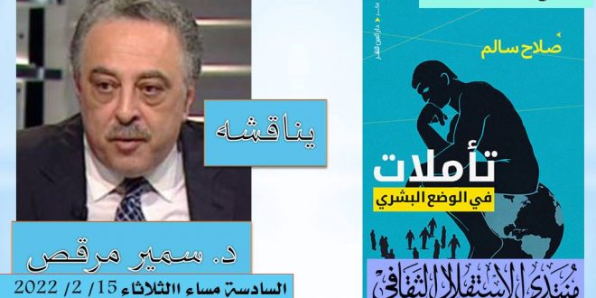 كيف تأمل صلاح سالم عالمه؟ يجيب عن هذا السؤال ويناقش الكتاب الموسوم “تأملات في الوضع البشري” الصادر عن دار العين للنشر والتوزيع، الدكتور أحمد يوسف أحمد، والدكتور سمير مرقص، والدكتور عمار علي حسن، وذلك في الندوة التي يديرها الشاعر أحمد سراج، ويعقدها منتدى الاستقلال في مقره بالدور الثامن في 2 شارع طلعت حرب، بالقرب من ميدان التحرير، السادسة مساء الثلاثاء الموافق 15 من فبراير 2022، ويستطيع الراغبون الحضور إلى مقر المنتدى.