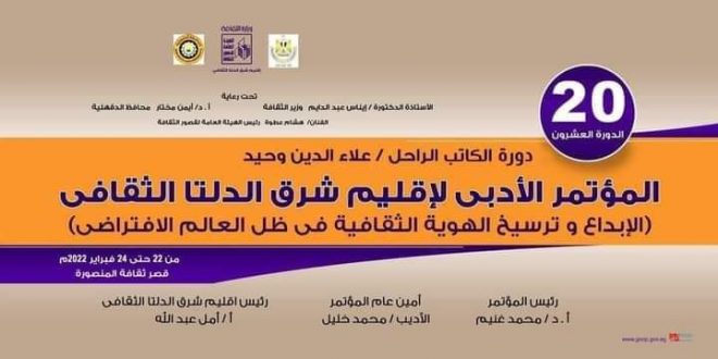 تبدأ غدا الثلاثاء 22 فبراير، فاعليات المؤتمر الأدبي لإقليم شرق الدلتا الثقافي، والذي ينطلق تحت عنوان ” الابداع وترسيخ الهوية الثقافية في ظل العالم الافتراضي”، دورة الكاتب الراحل: علاء الدين وحيد.