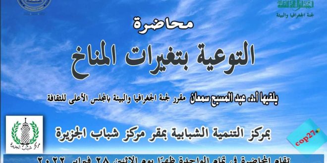 تحت رعاية الدكتورة إيناس عبد الدايم وزيرة الثقافة، والدكتور هشام عزمي الأمين العام للمجلس الأعلى للثقافة، تنظم لجنة الجغرافيا والبيئة ومقررها الدكتور عبد المسيح سمعان، محاضرة بعنوان: “التوعية بتغيرات المناخ”؛ وذلك في تمام الواحدة ظهرًا يوم الإثنين 28 فبراير الحالي بمركز التنمية الشبابية بمقر مركز شباب الجزيرة.