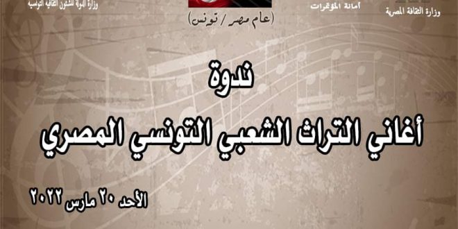 نظم المجلس الأعلى للثقافة بأمانة الدكتور هشام عزمي، ندوة “أغانى التراث الشعبى التونسى المصرى”؛ وذلك فى تمام (السادسة بتوقيت القاهرة) (الخامسة بتوقيت تونس) مساء الأحد الموافق ٢٠ مارس الحالي.