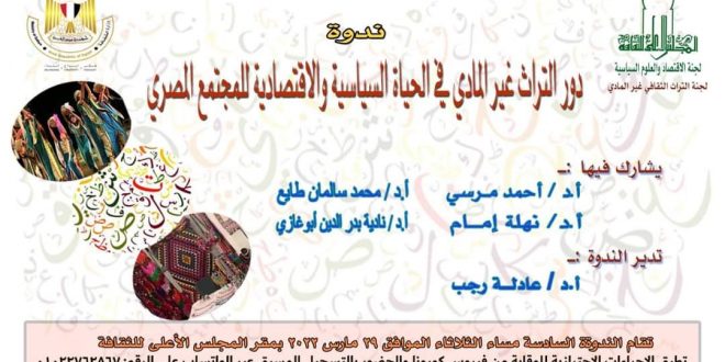 تنظم لجنة الاقتصاد والعلوم السياسية” ومقررتها الدكتورة عادلة رجب؛ بالتعاون مع لجنة التراث الثقافي غير المادى (الفنون الشعبية) ومقررتها الدكتورة نهلة إمام ، بالمجلس الأعلى للثقافة، ندوة بعنوان ” دور التراث غير المادي في الحياة السياسية والاقتصادية في المجتمع المصري”.