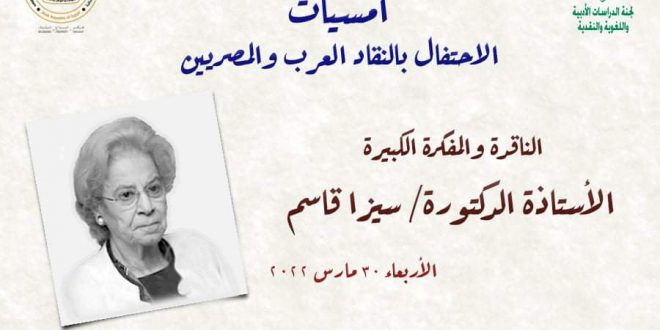 ويتم خلالها الاحتفاء بالتجربة الفكرية والأكاديمية للناقدة والمفكرة الكبيرة الدكتورة سيزا قاسم، وذلك في تمام السابعة مساء اليوم الأربعاء ٣٠ مارس الحالي أونلاين عبر تطبيق زووم.