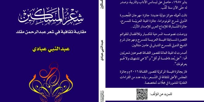 عن دار “ميتا بوك للطباعة والنّشر والتّوزيع” صدر مؤخرا كتاب “شعرُ المساكين .. مُقاربة ثقافية في شعر عبدالرّحمن مقلد” وهي قراءة ثقافية للشّاعر والكاتب المسرحي عبدالنّبي عبّادي، تناول فيه تجربة الشّاعر المصري عبدالرّحمن مقلد من خلال مجموعتين شعريتين لمقلد هُما: “مساكين يعملون في البحر” و “عواء مُصحّح اللُّغة”. وجاء الكتاب في مدخلٍ نظريّ وفصلين تطبيقيين حول أثر ثقافة النفي والتّهميش في شعر عبدالرّحمن مقلد.