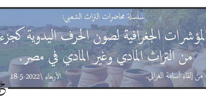 ضمن سلسة محاضرات التراث الشعبي، تقام ندوة ” المؤشرات الجغرافية لصون الحرف اليدوية كجزء من التراث المادي وغير المادي”، ويحاضر بها أسامة غزالي، في السادسة والنصف مساء اليوم الأربعاء 18 مايو، أون لاين.