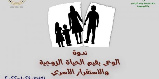 تحت رعاية الدكتورة إيناس عبد الدايم وزيرة الثقافة؛ يقيم المجلس الأعلى للثقافة بأمانة الدكتور هشام عزمي، ندوة “الوعى بقيم الحياه الزوجية والاستقرار الأسرى “؛ والتى تنظمها لجنة الفلسفة وعلم الاجتماع والانثربولوجيا ومقررها الدكتور أحمد مجدي حجازى، وذلك في تمام الثانية عشرة ظهرًا يوم الثلاثاء 24 مايو الحالى بقاعة الندوات بالمجلس الأعلى للثقافة.