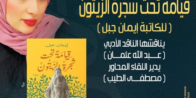 تستضيف مكتبة تنمية، فرع المعادي، حفل مناقشة وتوقيع رواية "قيامة تحت شجرة الزيتون" للكاتبة إيمان جبل. يناقشها في الحفل الكاتب والناقد الأدبي "عبد الله عثمان" ويدير النقاش مصطفى الطيب. يقام الحفل في تمام الساعة السابعة من مساء يوم الإثنين ٣٠ مايو.