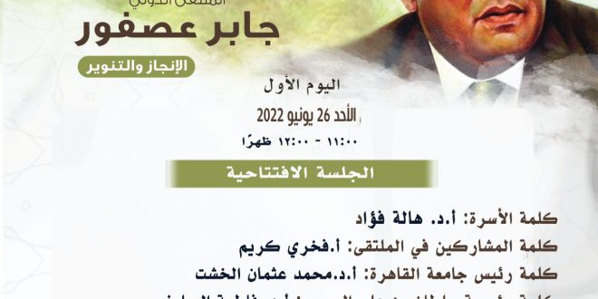 تليها الجلسة الأولى في تمام الساعة الثانية ظهرا تحت عنوان: “جابر عصفور أستاذًا وناقدًا”، ويشارك بها كل من: أحمد المنصورى – مصر، زهور كرام – المغرب، شكرى المبخوت – تونس، طارق النعمان – مصر، محمد بدوي – مصر، ويدير الجلسة عبد العزيز السبيل – السعودية.