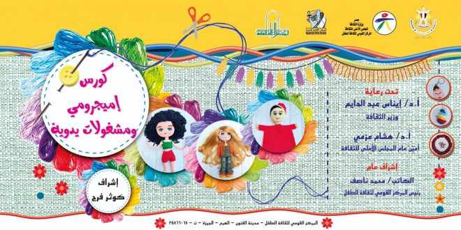 يبدأ المركز القومى لثقافة الطفل برئاسة الكاتب محمد ناصف كورس تعليم فن “إميجرومي” مشغولات يدوية وتطريز للأطفال من عمر ١٠ سنوات وأكثر، وذلك بحديقة الفنون بمقر المركز القومي لثقافة الطفل بالهرم،.