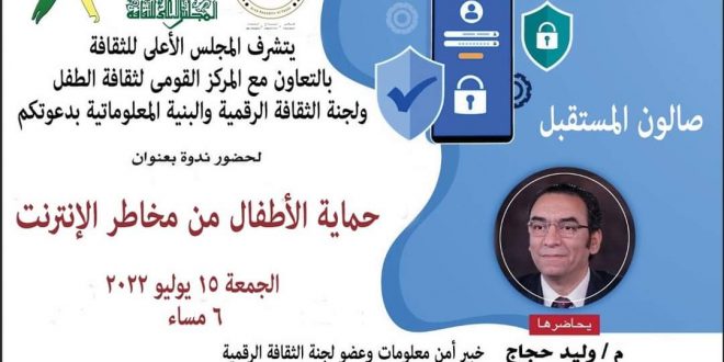 ويتناول الصالون غدا ندوة بعنوان “حماية الأطفال من مخاطر الانترنت” يقدمها المهندس وليد حجاج خبير أمن المعلومات وعضو لجنة الثقافة الرقمية، ويدير اللقاء م.زياد عبد التواب مقرر لجنة الثقافة الرقمية وعضو اللجنة العليا لجائزة الدولة للمبدع الصغير، بحضور الكاتب محمد ناصف رئيس المركز.
