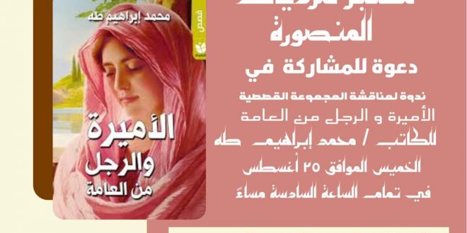يقيم مختبر سرديات المنصورة ندوته الشهرية، حيث يستضيف هذا الشهر الروائي والقاص الدكتور محمد ابراهيم طه، لمناقشة مجموعته القصصية “الأميرة والرجل من العامة”، الصادرة عن دار النسيم للنشر و التوزيع، وذلك يوم الخميس الموافق 25 اغسطس الجاري، في تمام الساعة السادسة مساءً.