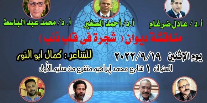 يناقش الديوان الشعراء النقاد أسامة حداد، أسامة جاد،  خالد حسان، ويقدم الندوة الشاعر محمود خيرالله.