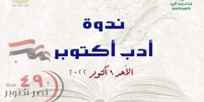 تحت رعاية الدكتورة نيفين الكيلاني وزيرة الثقافة؛ ينظم المجلس الأعلى للثقافة بأمانة الدكتور هشام عزمي؛ ندوة “أدب أكتوبر”، والتى تنظمها لجنة الدراسات الأدبية واللغوية والنقدية بالمجلس ومقررها الدكتور عبد الرحيم الكردي، وذلك في تمام السادسة مساء الأحد الموافق 9 أكتوبر الحالي بقاعة الفنون بالمجلس الأعلى للثقافة.