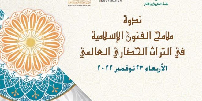 تحت رعاية الدكتورة نيفين الكيلاني وزيرة الثقافة، وبأمانة الدكتور هشام عزمي، والكاتب محمد عبد الحافظ ناصف رئيس الإدارة المركزية للشعب واللجان الثقافية، تنظم لجنة التاريخ والآثار ومقررتها الدكتورة علا العجيزى، ندوة “ملامح الفنون الإسلامية في التراث الحضاري العالمي”، في تمام الساعة العاشرة من صباح الأربعاء 23 نوفمبر بمتحف الفن الإسلامى.