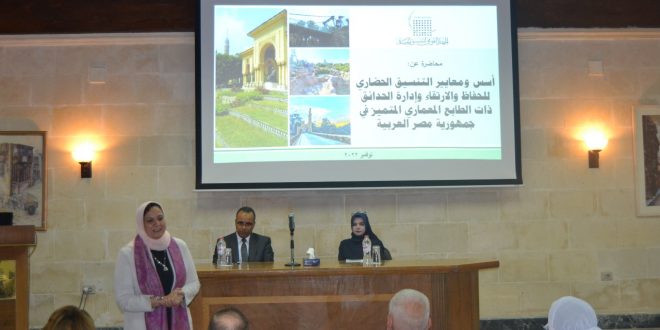 كما تم عرض كيفية الحفاظ والترميم للحدائق التراثية بكافة عناصرها من المساحات الخضراء والمباني التراثية بما يحقق التنمية المستدامة .