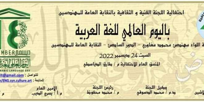 تقيم اللجنة الفنية والثقافية بنقابة المهندسين اليوم السبت 24 ديسمبر احتفالية خاصة باليوم العالمي للغة العربية.