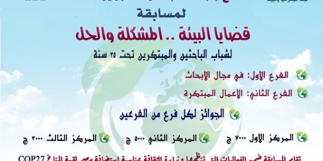تحت رعاية الدكتورة نيفين الكيلاني وزيرة الثقافة، وبأمانة الدكتور هشام عزمي؛ وإشراف الكاتب محمد ناصف رئيس الإدارة المركزية للشعب واللجان الثقافية، بعلن المجلس الأعلى للثقافة عن مد فترة المشاركة في مسابقة )قضايا البيئة المشكلة والحل) التي تنظمها لجنة الجغرافيا والبيئة بالمجلس برئاسة الدكتور عبد المسيح سمعان، وذلك في إطار الأنشطة التي تنظمها وزارة الثقافة بمناسبة استقبال جمهورية مصر العربية لقمة المناخ العالمى (cop27) بمدينة شرم الشيخ 2022 ؛ وانطلاقًا من دور المجلس الأعلى للثقافة في تشجيع ودعم شباب الموهوبين والنابغين والباحثين، وتمد المسابقة حتى 15 فبراير المقبل.