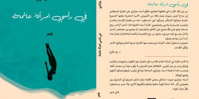 صدرت حديثاً، عن «الآن.. ناشرون ومُوَزِّعون» في عمّان، مجموعة شعرية بعنوان “في رأسي امرأة عائمة” للشاعرة والكاتبة الجزائرية أسماء جزائري، وتشارك بها الكاتبة في معرض القاهرة 54.