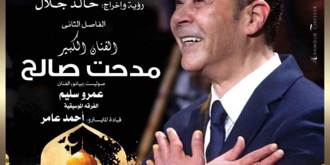 أما الفصل الثاني من الحفل، يُحييه النجم ”مدحت صالح”، بمشاركة صوليست البيانو، الفنان عمرو سليم، والفرقة الموسيقية، بقيادة المايسترو، أحمد عامر، حيث يشدو بمجموعة من أغانيه.