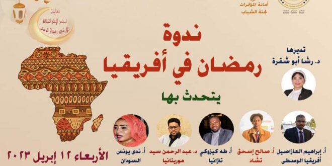 تدير الندوة الدكتورة رشا أبو شقرة عضو مجلس النواب المصرى وأمين سر لجنة الشئون الأفريقية، ويشارك بها إبراهيم العازاصيل “أفريقيا الوسطى”، وصالح إسحق عيسى كاتب ومؤلف وباحث في الشأن الإفريقي “تشاد”، وطه كيزوكي مدرس اللغة السواحيلية بكلية الدراسات الأفريقية العليا “تنزانيا”، والدكتور عبدالرحمن سيد المختار الرئيس الأسبق للاتحاد العام للطلاب الأفارقة في مصر “موريتانيا”، وندى يونس مذيعة أخبار ومقدمة برامج “السودان”.