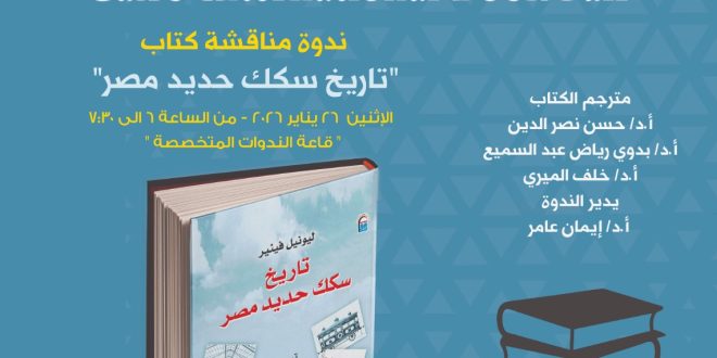 تحت رعاية الدكتور أحمد فؤاد هنو وزير الثقافة المصري، وفي إطار الدور التنويري الذي تقوم به وزارة الثقافة، ينظم المركز القومي للترجمة برئاسة الأستاذة الدكتورة رشا صالح ندوة لمناقشة الكتاب الصادر حديثًا “تاريخ سكك حديد مصر”، وذلك غدًا الأحد 26 يناير 2026، في تمام السادسة مساءً، بقاعة الندوات المتخصصة ضمن فعاليات معرض القاهرة الدولي للكتاب.