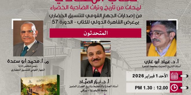تحت رعاية وزير الثقافة المصري الدكتور أحمد فؤاد هنو  يشهد معرض الكتاب الدولي في دورته السابعة والخمسين ندوة عن كتاب المعادي لمحات من تاريخ وتراث الضاحية الخضراء خامس اصدارات سلسلة ذاكرة المدينة ، التي يعقدها الجهاز القومي للتنسيق الحضاري برئاسة مهندس استشاري “محمد ابو سعده ” ، وذلك في تمام الساعة الثانية عشرة ظهراً وحتى الواحدة والنصف مساءً يوم الاحد المقبل ١ فبراير ٢٠٢٦ بقاعة كاتب وكتاب بلازا (١) بمعرض الكتاب الدولي في دورته السابعة والخمسين بأرض المعارض الدولية بالتجمع الخامس .