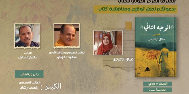 ينظم المركز الدولي للكتاب بوسط القاهرة، حفل توقيع و مناقشة المجموعة القصصية “الوجه الثاني” الصادر عن الهيئة العامة للكتاب للكاتبة والصحفية منال الأخرس، وذلك في الخامسة من مساء الأربعاء ١١ فبراير.