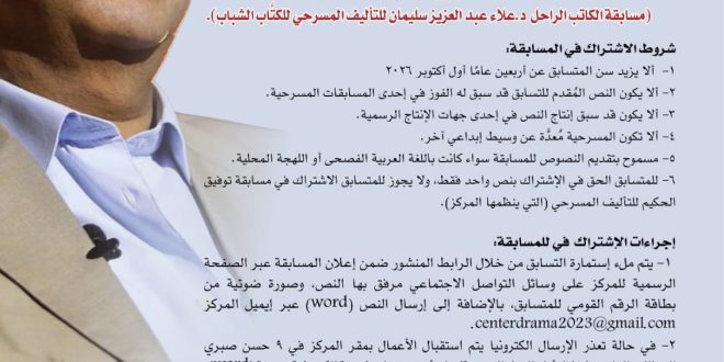 أعلن المخرج عادل حسان مدير المركز القومي للمسرح والموسيقى والفنون الشعبية؛ استمرار فتح التقديم لمسابقة الكاتب الراحل الدكتور علاء عبد العزيز سليمان للتأليف المسرحي للكتّاب الشباب للعام ٢٠٢٥م/ ٢٠٢٦م حتى ٢٨ فبراير ٢٠٢٦م، وذلك لمنح الفرصة للكتاب الشباب للتقدم للتقدم إلى المسابقة.