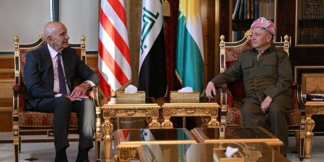 استقبل الزعيم الكردي مسعود بارزاني، الاثنين، في بيرمام، توم باراك، مبعوث الرئيس الأمريكي دونالد ترامب لشؤون سوريا والسفير الأمريكي لدى تركيا.
