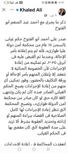 نشر خالد علي المحامي بالنقض، عبر حسابه الرسمي على فيس بوك، فجر اليوم السبت، التفاصيل الكاملة لإجراءات محاكمة أحمد عبد المنعم أبو الفتوح.