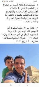 حيث انتظرنا أن تقوم النيابة خلال ٤٨ ساعة من صدور الحكم المستأنف فى ٩ فبراير ٢٠٢٦ إما بإطلاق سراحه، لحين بت مكتب شئون أمن الدولة فى أمر الحكم المستأنف وحكم إعادة الإجراءات، أو تقوم النيابة بعرضه على غرفة المشورة بمحكمة الجنح المستأنفة للنظر فى أمر حبسه، إلا أن ذلك لم يحدث، فانتظرنا عدة أيام، وقدم فريق الدفاع طلب للنائب العام يوم ١٦ فبراير ٢٠٢٦، حمل رقم ١٦٨٢١ عرائض نائب عام، نطالب فيها بالإفراج الفورى عنه لسقوط أمر الحبس منذ أكثر من ٥ أيام، فى اليوم التالى ١٧ فبراير ٢٠٢٦ فوجئنا بالصدفة- دون إخطارنا- باستقدام أحمد من محبسه لمحكمة الجنح المستأنفة لعرضه عليها، وتمكنا من الحضور معه بغرفة المشورة وتمسكنا بسقوط أمر الحبس لعرضة بعد ٩ أيام من صدور الحكم الاستئنافي، وكان من الواجب عرضه على المحكمة خلال ٤٨ ساعة من صدور الحكم الاستئنافي، فضلاً عن غياب أى نص قانونى يُجب حبسه، والعكس هو الصحيح، لكن غرفة المشورة أصدرت قرار بحبسه ١٥ يوم، فتقدم فريق الدفاع يوم الأربعاء ١٨ فبراير ٢٠٢٦ بطلب للنيابة باستئناف قرار غرفة المشورة بحبس أحمد، ولم يتم حتى الآن تمكينه أحمد من حقه فى استئناف أمر الحبس.