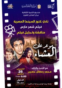 يتم عرض ومناقشة «موعد على العشاء» بسينما الهناجر ضمن نادي كنوز السينما المصرية غدا الخميس.