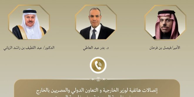 جرى اليوم، اتصالان هاتفيان بين بدر عبد العاطي وزير الخارجية والتعاون الدولي والمصريين بالخارج، و الأمير فيصل بن فرحان وزير خارجية المملكة العربية السعودية، والدكتور عبد اللطيف بن راشد الزياني وزير خارجية مملكة البحرين.