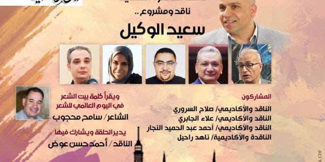 ينظم بيت الشعر العربي التابع لقطاع صندوق التنمية الثقافية المصري، حلقة جديدة من سلسلة “حلقة القاهرة النقدية” ( ناقد ومشروع ) لمناقشة تجربة الناقد والأكاديمي سعيد الوكيل.
