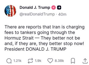 قال الرئيس الأمريكي دونالد ترامب، إن هناك تقارير تقول إن إيران تفرض رسوما على ناقلات النفط المارة في مضيق هرمز.