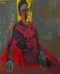 كما أن اللون عند مولاي يوسف ، لا يعمل كعنصر تزييني، بل كقوة بنائية تعيد تعريف الجسد الجالس. حين يتخذ الجسد لوناً أحمر، فإننا لا نكون أمام توصيف انفعالي مباشر، بل أمام تكثيف بصري يُحوّل الجسد إلى طاقة. الأحمر، بوصفه لوناً حاداً ومباشراً، يكسر وهم السكون، ويكشف عن توتر داخلي يتجاوز حدود الشكل. الجسد الجالس يبدو مستقراً، لكن اللون يعلن عن حالة احتراق كامنة، عن كثافة شعورية تجعل من الكتلة البصرية مجالاً للانفعال. في هذا المستوى، يصبح اللون بديلاً عن الحركة، ما لا يُقال بالإيماءة يُقال بالصبغة.