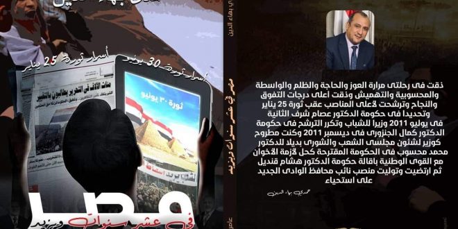 عن دار الأديب للنشر، صدر مؤخرا للكاتب والروائى والشاعر المستشار حمدى بهاء، كتاب “مصر فى عشر سنوات ويزيد”. يناقش الكتاب أسرار ثورة يناير وثورة ٣٠ يونيو وقيادات وشخصيات ونظرة تحليلة واسرار لم يعرفها أحد. من أجواء الكتاب نقرأ: ربما من يقرأ هذا الكتاب يظن فى مرحلة ما أنى عدو للإخوان …