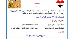 تستضيف مكتبة مصر الجديدة العامة حفل توقيع ومناقشة رواية “حسن وحورية .. ملحمة العشق والنصر” للشاعرة مريم توفيق ، وذلك في الساعة الخامسة من مساء غد السبت ، بمقر المكتبة 42 شارع العروبة مصر الجديدة . الرواية ترصد قصة حب بداية من حرب الاستنزاف وانتهاء بنصر أكتوبر، وتتضمن الرواية العديد …