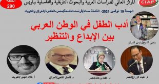 يستضيف المركز العالمي للدراسات العربية والبحوث التاريخية والفلسفية بباريس، اليوم الجمعة ١٩ نوفمبر، في التاسعة مساء، ندوة، بعنوان “أدب الطفل في الوطن العربي بين التنظير والإبداع”، عبر الإنترنت. يحاضر بها أبرز الأقلام العربية التي أبدعت في أدب الطفل بكل أجناسه من رواية وقصة وشعر ومسرح، منهم : د.عبده الزراع ” …