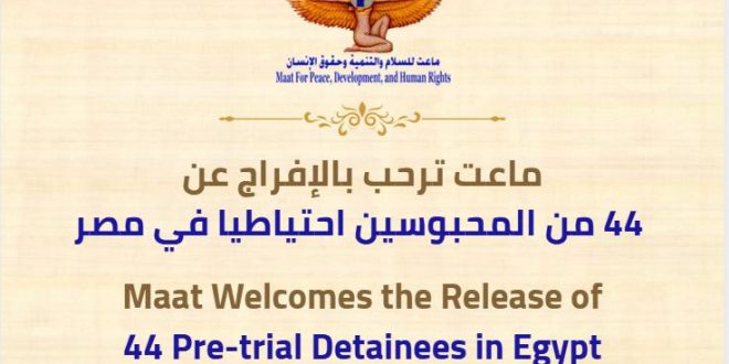 رحبت مؤسسة ماعت للسلام والتنمية وحقوق الإنسان، في مصر، بالإفراج عن 44 من المحبوسين احتياطياً على ذمة قضايا مختلفة. وقالت ماعت في بيان اليوم إن من بين المفرج عنهم سيد مشاغب، وشريف الروبي، والناشطة نيرمين حسين. قرارات النيابة العامة وتابعت ماعت: تأتي هذه الخطوة استكمالا لخطوات مماثلة اتخذتها …