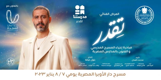 ينطلق غداً السبت العرض المسرحي “تقدر” في دار الأوبرا، والذي يأتي ضمن مبادرة وزارة التربية والتعليم بالتعاون مع وزارة الثقافة و بالمشاركة مع قنوات مدرستنا، وبرعاية الشركة المتحدة للخدمات الإعلامية لإحياء المسرح المدرسي. العرض سيستمر على مدار يومي السبت والأحد 7 و 8 يناير و يضم مجموعة من نجوم الفن …
