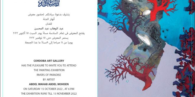 يفتتح جاليري قرطبة في تمام الساعة السادسة مساء يوم السبت القادم الموافق 15 أكتوبر 2022 معرض أنهار الجنة للفنان عبد الوهاب عبد المحسن، والذي يضم لوحات تم إنتاجها حديثا، حيث ستعرض تلك الأعمال على الجمهور للمرة الأولى خلال المعرض، ومن المقرر أن يستمر لمدة شهر كامل حتى 15 من نوفمبر …
