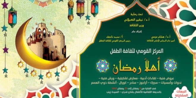 تحت رعاية الدكتورة نيفين الكيلاني وزيرة الثقافة، وإشراف الدكتور هشام عزمي أمين عام المجلس الأعلى للثقافة، يفتتح المركز القومي لثقافة الطفل برئاسة الكاتب محمد ناصف ليالي “أهلا رمضان” بالحديقة الثقافية للأطفال بالسيدة زينب بإدارة الباحثة ولاء محمد، وذلك مساء اليوم الخميس ٨ رمضان – ٣٠ مارس٢٠٢٣ فى تمام الساعة التاسعة …
