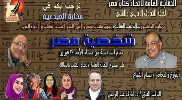 تنظم لجنة التذوق الأدبي والفني بإتحاد كتاب مصر، أمسية ثقافية بعنوان “شخصية مصر”، في السادسة من مساء غدا الأحد ، الموافق ٢٠ فبراير الجاري، بمقر مسرح الاتحاد في الزمالك. تستضيف الأمسية كل من: المؤرخ وعالم المصريات والمحاضر الدولي بسام الشماع، والناقد الفني والموسيقار د. أشرف عبد الرحمن، بحضور أعضاء اللجنة …