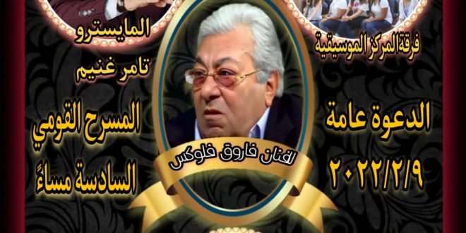 برعاية وحضور وزيرة الثقافة الأستاذة الدكتورة إيناس عبد الدايم، وبإشراف رئيس قطاع شئون الإنتاج الثقافي المخرج الكبير خالد جلال؛ يقيم المركز القومي للمسرح والموسيقى والفنون الشعبية برئاسة الفنان القدير ياسر صادق؛ احتفالية كبرى لتكريم الفنان الكبير فاروق فلوكس، تقديم الإعلامية المتميزة بسنت بكر، وذلك في السادسة مساء غد الأربعاء ٩ …