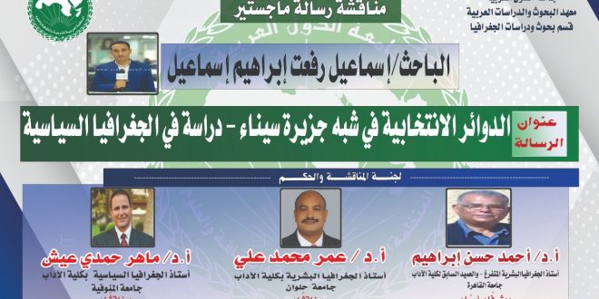 تناقش لجنة التحكيم والمناقشة رسالة ماجستير في الدراسات الجيوسياسية مقدمة من الصحفي و الباحث إسماعيل رفعت الصحفي مؤسسة وجريدة اليوم السابع، كأول رسالة علمية لتشكيل الدوائر الانتخابية البرلمانية بعد 2013 على أسس سياسية تمنع الجماعات من التلاعب بالدولة. الرسالة تتناول الدوائر الانتخابية كدراسة في الجغرافيا السياسية، ترسيما وتحليلا، وقيام مؤسسة …